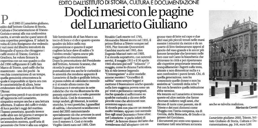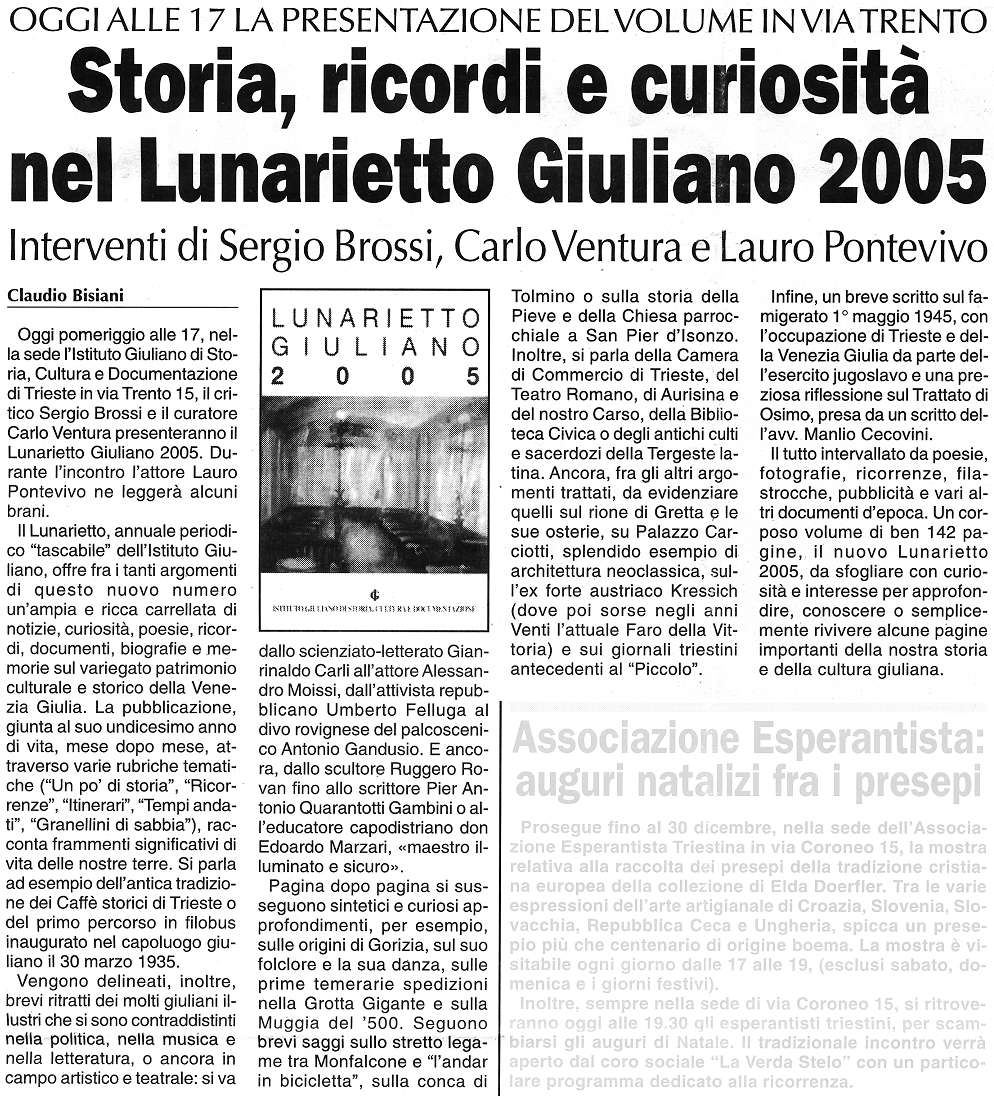 Hanno scritto di noi - dai quotidiani della Venezia Giulia a fianco: TRIESTE OGGI del 21 dicembre 2004 sotto: VOCE ISONTINA del 1° gennaio 2005 per ingrandire gli articoli cliccare sui medesimi. |